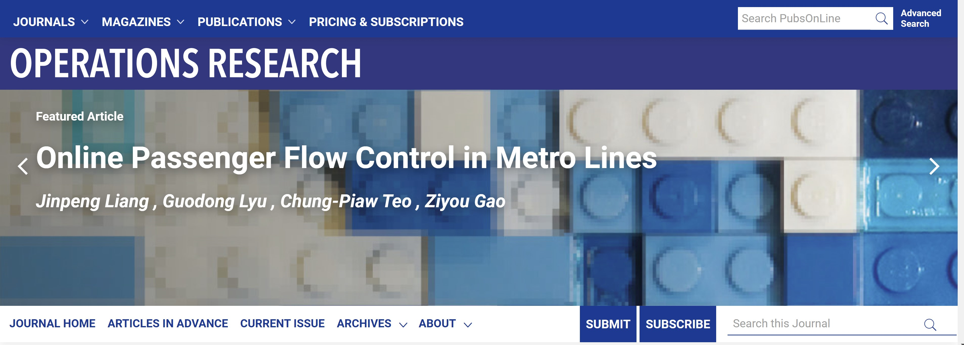 在国家自然科学基金基础科学中心项目和青年基金项目(批准号:72288101,72101042)资助下,91制片厂 高自友教授团队与新加坡国立大学张俊标教授团队合作,针对大城市轨道交通的高峰时段客流控制问题开展研究,设计了基于实时需求信息的客流控制策略。该成果以“城市轨道交通在线客流控制(Online Passenger Flow Control in Metro Lines)”为题,于2023年发表在《运筹学》(Operations Research)上,论文链接: //doi.org/10.1287/opre.2022.2417,并被选为当期的两篇亮点论文(Featured Article)之一(如图1所示)。
